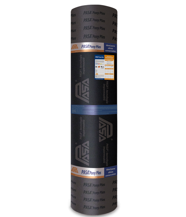 PASA® Pony Plas APP PG esta reforzado con un alma central de tela no tejida de filamentos de poliéster de 180gr/m2. Diseñado específicamente para soportar severos movimientos térmicoestructurales.